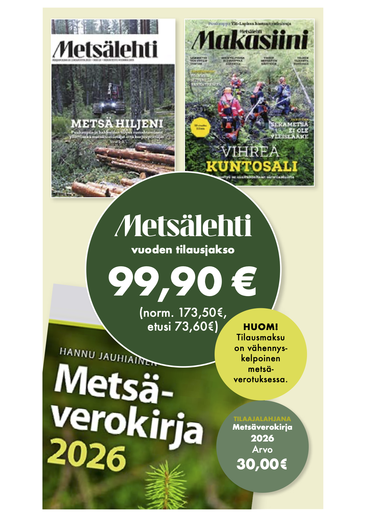 Toimi heti, niin saat seuraavaksi ilmestyvän jäsenhintaisen Metsälehden kotiin kannettuna, sekä tilauskautena ilmestyvän Metsäverokirjan (arvo 30,00 €).