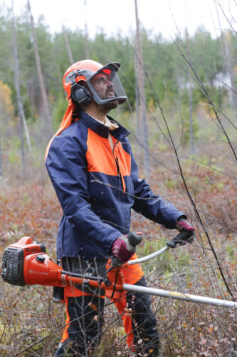 ”Välissä pidän ruokatauon. Raivatessa mukana kulkee juomapullon lisäksi pieni bensapullo, jotta tyhjän tankin kanssa ei tarvitse palata bensapöntölle. Tässä on oppinut monia pieniä juttuja, jotka sujuvoittavat työtä.”