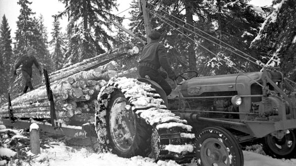 Mauno Mannelinin kuva-arkistosta löytyy tuhansia kuvia sotien jälkeisestä metsätyöstä. Traktoreita on kuvattu kattavasti.