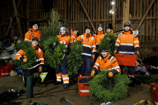 Ladossa käy kova kuhina, kun päivän asennusten tarvikkeet pakataan autoihin. Mukaan lähtee jouluvaloketjuja punaisissa laatikoissa, kuusenjalkoja ja tikapuita. Kuusia säilytetään ulkona.