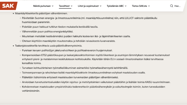 SAK:n linjauksessa korostetaan maankäyttöä ja metsiä koskevan LULUCF-sektorin päästökuilun huomioon ottamista.