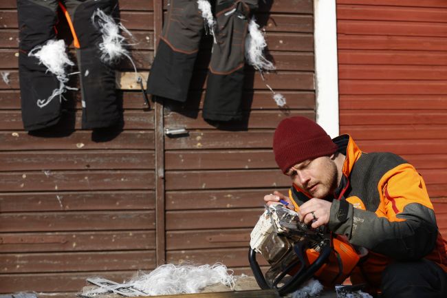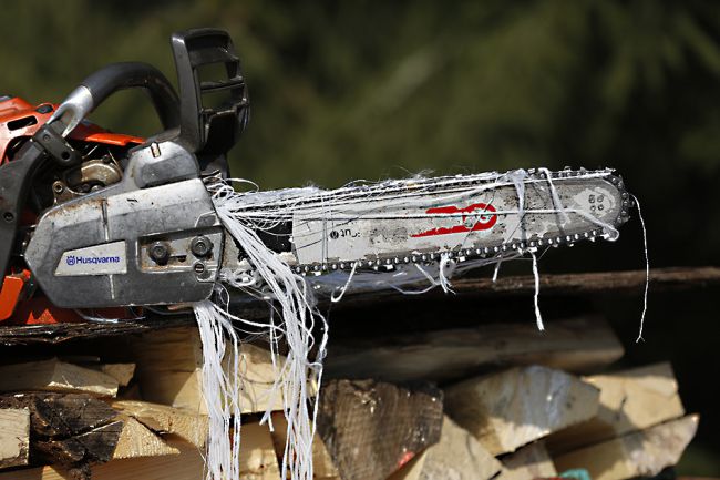 Ensimmäinen havaintomme oli huojentava. Täydellä kaasulla iskeneen Husqvarnan ketju pysähtyi niin nopeasti, että puolet viiltosuojakerroksista jäi ehjiksi. Vahingosta olisi siis selvitty vammoitta.