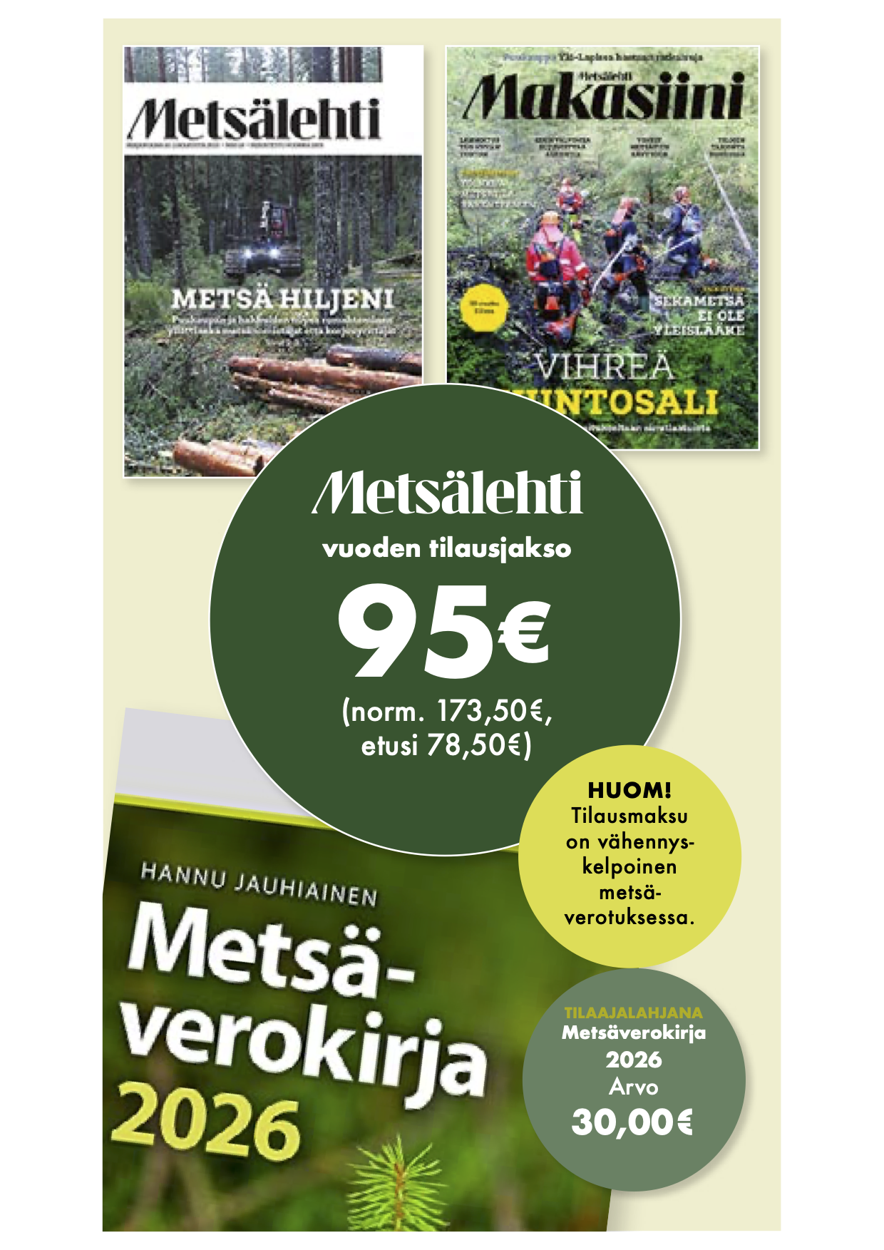 Toimi heti, niin saat seuraavaksi ilmestyvän jäsenhintaisen Metsälehden kotiin kannettuna ja Metsälehti Digin käyttöösi (arvo 142,80 €), sekä tilauskautena ilmestyvän Metsäverokirjan (arvo 30,00 €).
