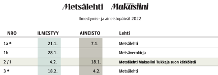Vuoden 2022 ensimmäinen numero ilmestyy 21. tammikuuta. Kyseessä on osoitteellinen lisäjakelunumero, jonka kohderyhmänä on metsänomistajat. Seuraava lisäjakelunumero on helmikuun ensimmäinen Metsälehti, joka tipahtaa postilaatikoihin 18. helmikuuta.