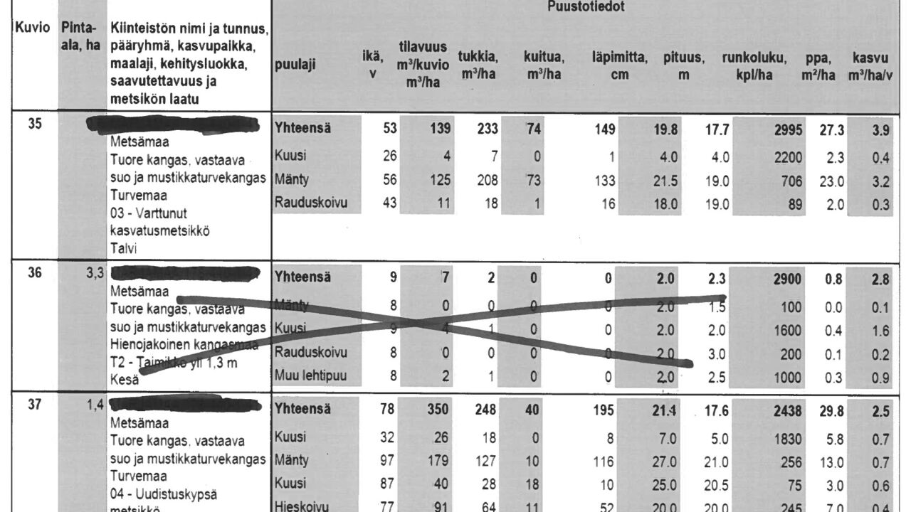 Itselle yksi vaikeimmista mietinnöistä tuntuu aina olevan, säästääkö alikasvos vai ei. Pidempään hallussa olleisiiin kohteisiin en päästä alikasvosta syntymään, mutta ostokohteissa niitä on. Miten raatilaiset tekisivät oheisen kuvioluettelon kuvioille 35 ja 37? Kuviolle 35 voisi miettiä vielä harvennusta, mutta kuvio 37 uudistushakkuukypsä. Alikasvoskuuset ovat molemmilla kuvioilla suht tasaisesti jakautuneita. Molemmat kuviot ovat noin 50 metriä leveitä, ja rajautuvat taimikkoon.