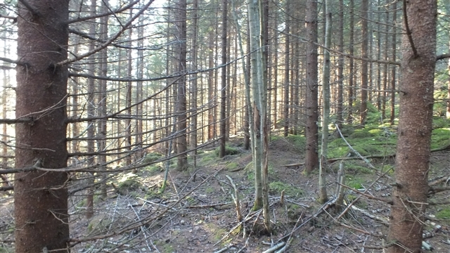 Hyvälaatuisen näköinen kuusikko.Suoraa ja pikkuoksaista.Näissä rinteissä onnistuu hyvin.Savimailla avojuurikuusi-istutuksissa usein laatua heikentävää lenkoutta