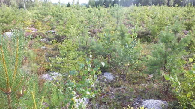 Tämäkin kohde hakattiin 2012 (kasvoi lähes 1 m3:n puita reilu 200/ha) Äestettiin ja kylvettiin männylle 2013 ja istutettiin 1000 kuusta/ha 2014. Siis samat metelmät kuin ”uudistumista” ja uudistumista-kuvissa. Kuten näkyy lehtipuuta on vähemmän. Hirvetkin ovat mukana perkaustalkoissa. Syövät koivuntaimien latvoja.