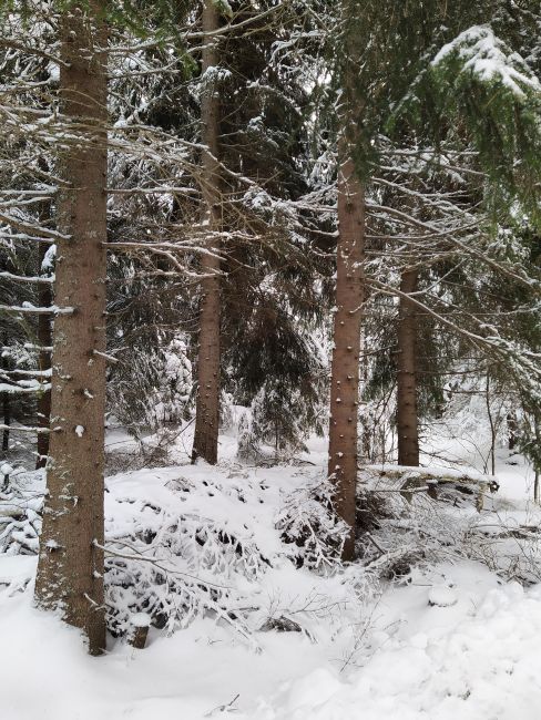 Kakkoskuvassa hiukan näkyy synkeämpää taustaa ja siellä juuri tänäänkin yritin repiä raippoja alas. Joka ei kaikkein miellyttävintä nyt kun lumi satoi märkänä oksiin ja ne on kuin liimattu toisiin puihin kiinni. Pitää tehdä tuplasahaus eli katkaista vielä rinnankorkeudelta uudesti että saa putoamaan ensin alaspäin.