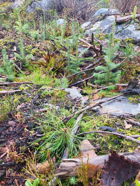 Näyttäisi olevan rehevä paikka, kun kiviä näkyy ja aukosta tulee monimuotoinen, kun lahopuutakin on. Nopeasti on kuusen siemenet nousseet. Tuo isompi männyntaimi on parivuotinen ja ensi kesänä tekee ensimmäisen oksakiehkuran ja kasvaa yli 10 cm pituutta ja seuraavana jo 50cm.