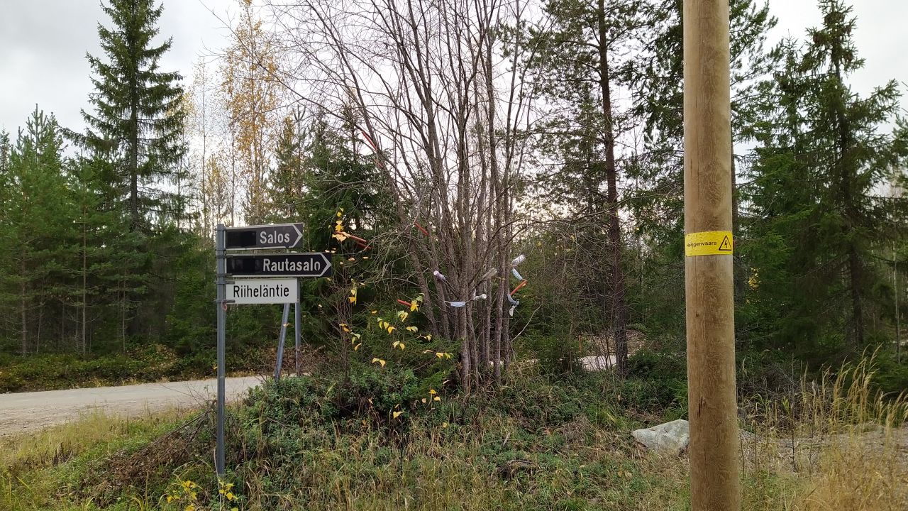 Aurausvitanpätkiä on ollut syksyisin oksiin viritettynä jo vuosia. Tällainen keskittymä otti jo enemmän silmään. ….ja vielä juomapulloilla terästettynä . Sikaa on pelattu kuvan risteyksessä.