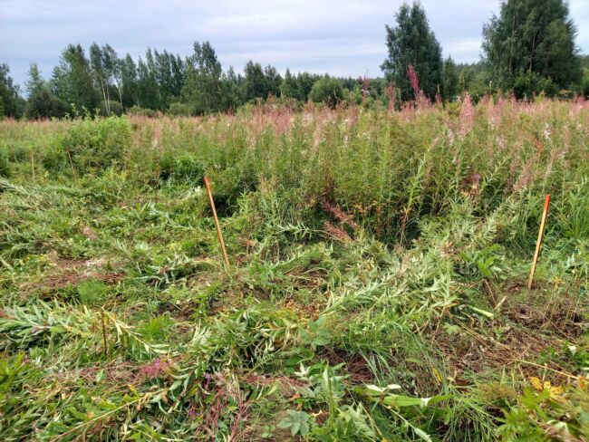 Tänä vuonna heinä tuntui kasvaneen todella pitkäksi. Paikoitellen reilusti yli 2 metristä. Taimia ei meinannut kunnolla löytää ollenkaan. Suoritin heinäyksen taas loppukesästä jalan. Käyttäen edelleen apuna omatekoista työkalua. Ajankohta sattui taas aktiivisimmillaan elo-syyskuun taitteeseen. Aikaa tänä vuonna heinäykseen kului 53 tuntia. Alueella oli todella paljon ampiaisen pesiä tänä vuonna. Varsinkin raivaamattomissa pajupuskissa. Syyskuun lopulla kävin raivaamassa raivaussahalla kaiken vesakon. Tähän meni aikaa 5 tuntia.