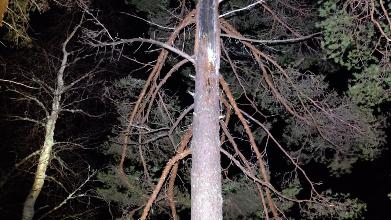 Tuota samaa pähkäilin myös mitä metsomies. 2 tod. näk. vaihtoehtoa joko iso haara pudonnut kyydistä tai toinen puu hangannut kylkeen. Viereinen mänty on näköjään myös täysin toispuoleinen oksistoltaan. Olisiko saunanrakennusvaiheessa puut karsittu toispuoleisiksi jotta eivät kaadu niin helposti mökin päälle tuulissa. Jos salama iskee puuhun, niin yleensä kapeahko halkeama on maahan asti. Entisen kotitalon pihassa iski kerran salama kuusipuiseen lipputankoon ja kierteiset n. 5-10 cm leveät sälöt lenteli n. 50 m säteellä ympäristöön.