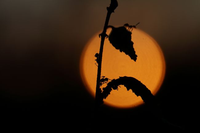 Pienen koivun oksalla yhteiselo piirtyy pilvettömään taivaanrantaan laskevaa aurinko vasten.