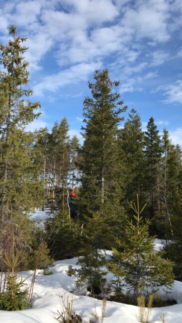 Pääkuva kesältä, vuosi boorin levittämisen jälkeen. Kuvio on pieni luontaisesti syntynyt, jota kunnostettiin muutama vuosi sitten. Boori levitettiin toisen kuvion jämistä. Lisäkuvassa näkyy, että 3 vuotta sitten latvakasvaimia ei ollut, nyt latvat palanneet. Ei optimi maaperä kuuselle, mutta ojan pientareella menestynee riittävästi ja luultavasti ensi vuonna kasvaa vielä paremmin.