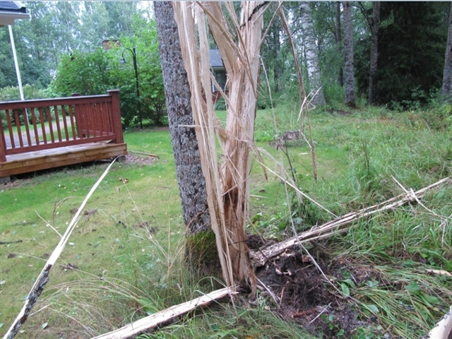 Sen verran oli tuhoa aiheuttanut että terassilaudoitus oli säpäleinä, kivijalka katki ja sulaketaulussa sai napsutella melki kaikki sulakkeet takaisin normi-asentoon. Puun sälää löytyi 30 metrin päästä nurmikoltakin vielä. Lisäksi antennin vahvistin ainakin oli mennyt rikki. Mökin ikkunalautakin oli tippunut, sen verran oli tärähtänyt kun oli mökkiin maadoittanut tuo salama.