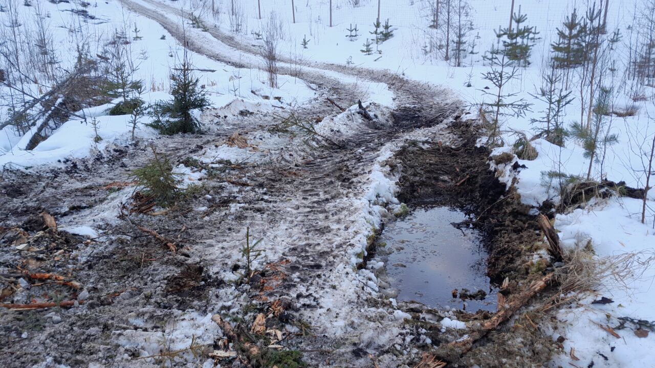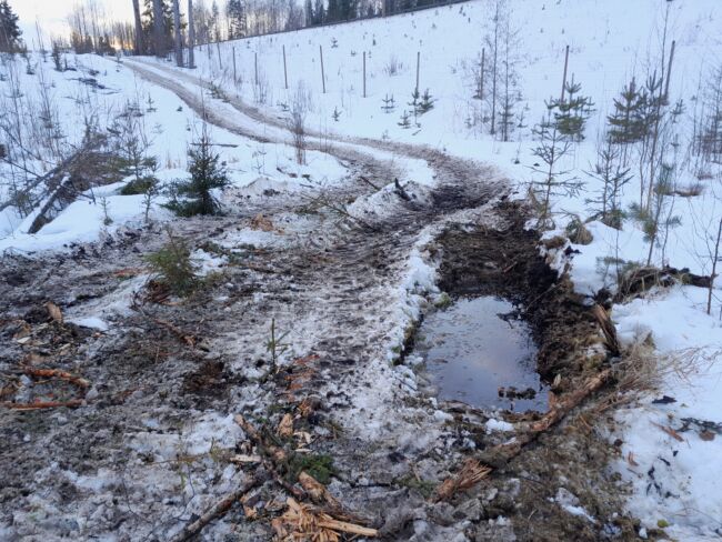 Puut 224m³ joutui kuljettamaan pehmeän kohdan yli. Vasen puoli on käyty etukäteen moottorikelkan kanssa tamppaamassa, oikealla on heti upottanut, kun kone on oikaissut tampatun alueen ulkopuolelle. Siitä näkee, millaiseksi rämpimiseksi olisi mennyt ilman valmisteluja.
