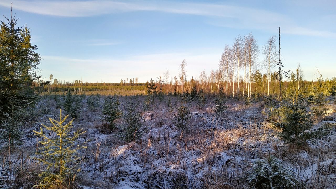 Kuvassa varhaisperkaus on ajoitettu oikein . Lähemmäs 10ha:n uudistusala on hyvässä kasvussa. Ennen uudistamista paikalla huojui yli-ikäinen ja kitukasvuinen korpikuusikko. Nyt alueen vanhat metsät on päivitetty tähän päivään ja tulevaisuus näyttää hyvältä.