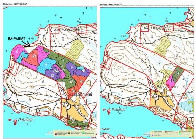 RA-paikat avautuvat länteen/luoteeseen. Yhdellä n. 5 000 m2:n RA-paikalla on rakennusoikeutta 200 k-m2, rantaviivaa n. 70 m.