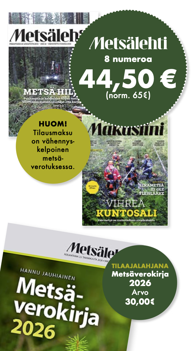 Tilaamalla Metsälehden nyt saat tilaajalahjana Kolo Design suodatinpussitelineen (arvo 20,50 €). Lisäksi osallistut arvontaan, jossa voit voittaa metsurin varusteet ja moottorisahan (arvo 2300 €)!