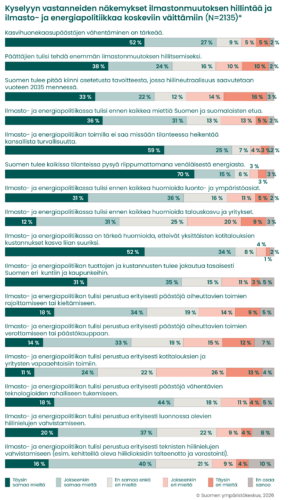 Venäläisestä energiasta halutaan eroon. 85 prosenttia katsoi, että Suomen tulee kaikissa olosuhteissa pysyä riippumattomana venäläisestä energiasta. Lähes yhtä suuri joukko, 84 prosenttia, oli sitä mieltä, että ilmasto- ja energiapolitiikan toimilla ei saa heikentää kansallista turvallisuutta.
