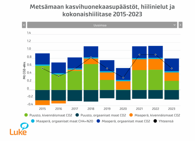 Lappi erottuu selvästi muista maakunnista: siellä puusto ja maaperä ovat molemmat sekä kivennäis- että turvemailla selkeitä hiilinieluja. Useassa eteläisessä maakunnassa sen sijaan vain turvemaiden puusto toimi vuonna 2023 hiilinieluna.